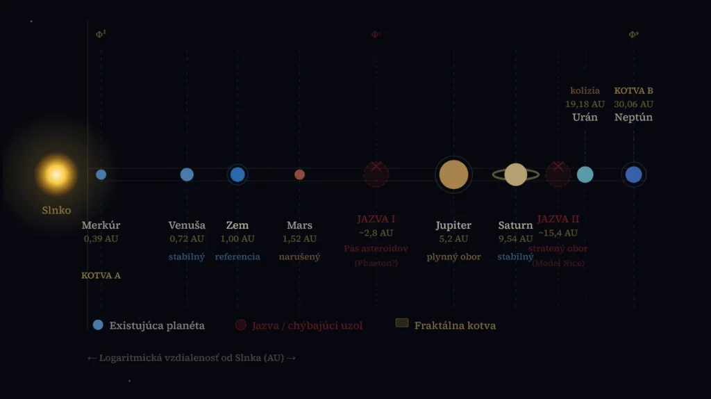 Planéty v jednoduchých rezonanciách (2:1, 3:2) by si posielali ničivé gravitačné „správy", ktoré by systém rozbili. Iracionálnosť Φ zaručuje, že tieto interferencie sú minimalizované — je to optimálny frekvenčný kanál pre dlhodobú stabilitu.